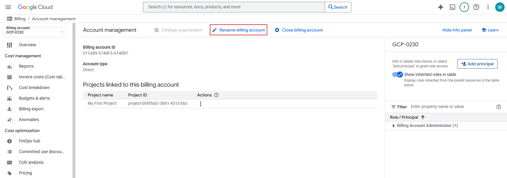 点击账号管理,点击重命名结算账号,输入新的账号名称GCP-0230