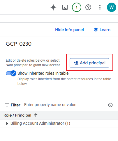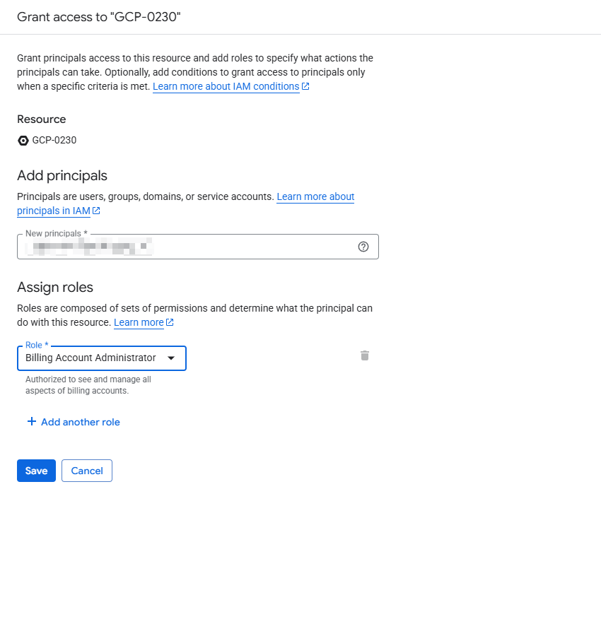在添加成员窗口,填写希望接收赠金转移的谷歌云账户xxxxx@gmail.com,选择角色 Billing account administrator(账单账户管理员),点击保存。
