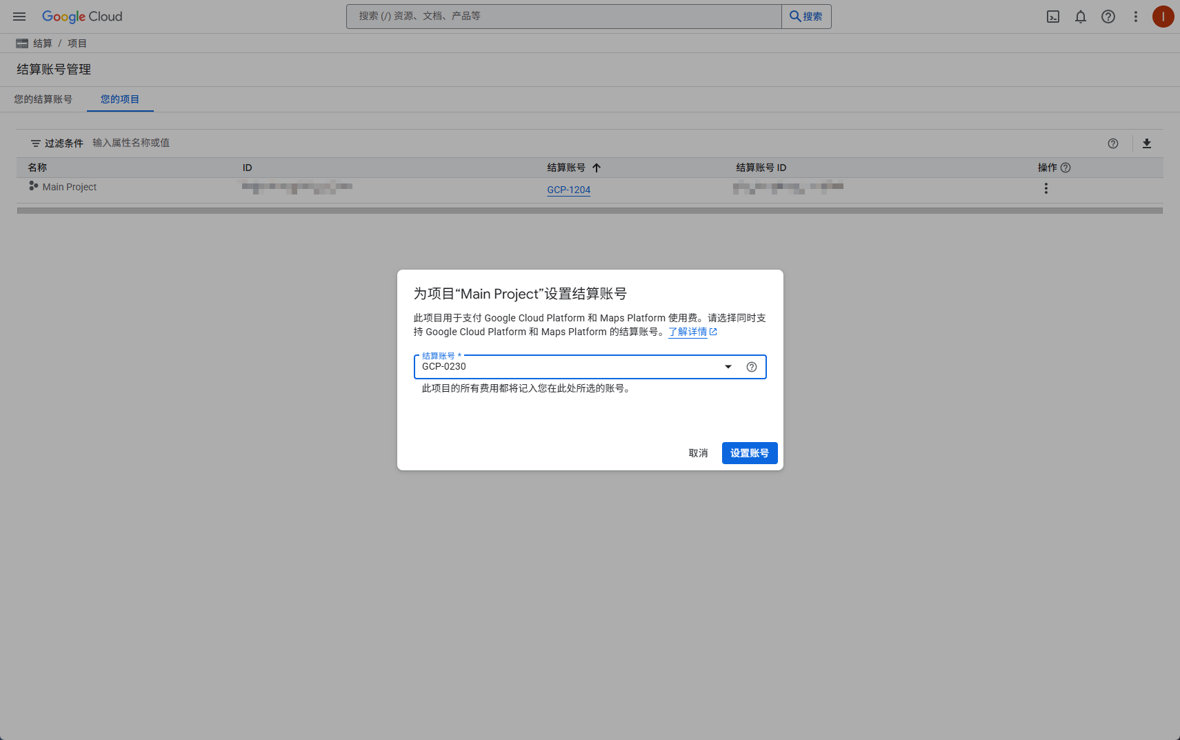 切换登录到接收赠金转移的谷歌云账户xxxxx@gmail.com,进入控制台,转到结算页面,点击您的项目,点击结算项目后面的操作按钮,点击更改结算信息,在设置结算账号弹窗中,选择新的结算账号GCP-0203,点击设置账号,完成转移结算。